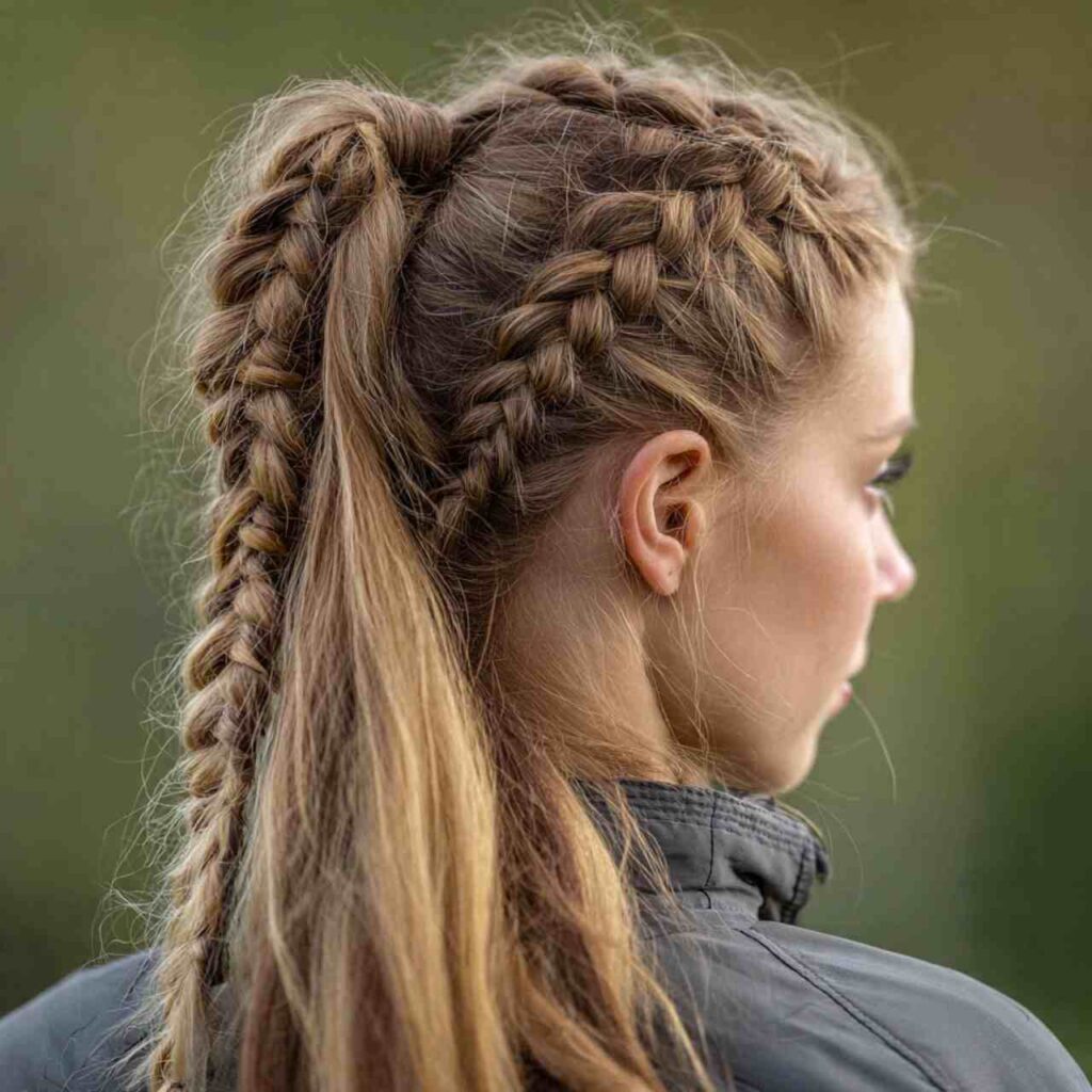 Create a high ponytail, then braid the length—either a classic three-strand, fishtail, or dutch braid. Alternatively, add small braids along the sides before gathering into the ponytail. Secure the braid end with an elastic. This works for athletic activities, casual work days, weekend outings, or active days when you need everything secured but still want style. The braid ensures hair stays put even during movement.