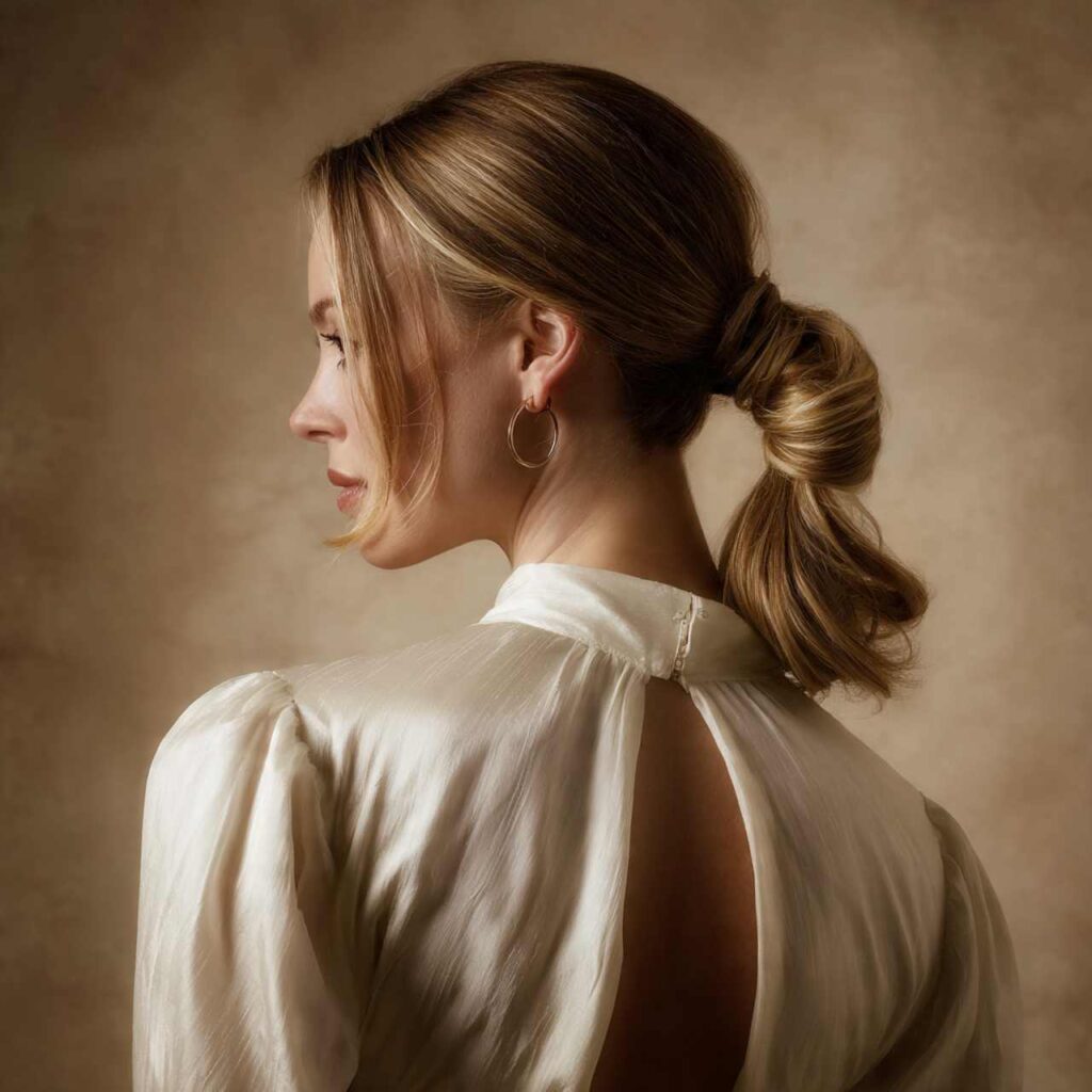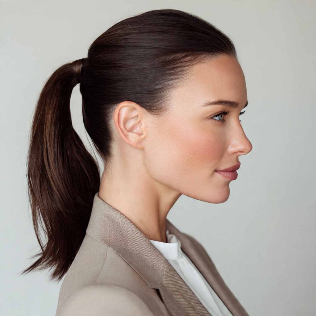 Position your ponytail at the mid-back of your head not at the crown, not at the nape, but perfectly in between. Smooth hair sleekly on all sides. This neutral positioning works for virtually everyone and any occasion. It’s professional enough for work, polished enough for events, and casual enough for everyday. The middle ground makes it incredibly versatile.