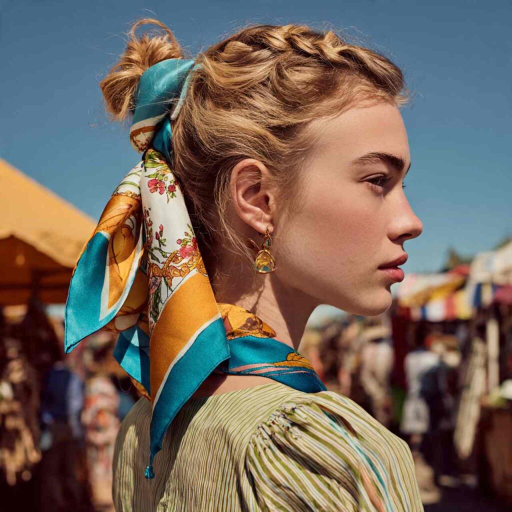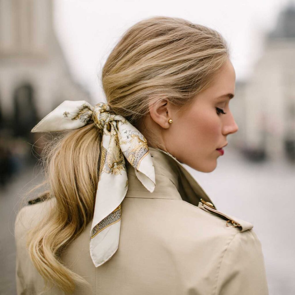 Wrapping a silk or patterned scarf around your ponytail base adds color, pattern, and vintage-inspired charm. This simple addition transforms a basic ponytail into something special.