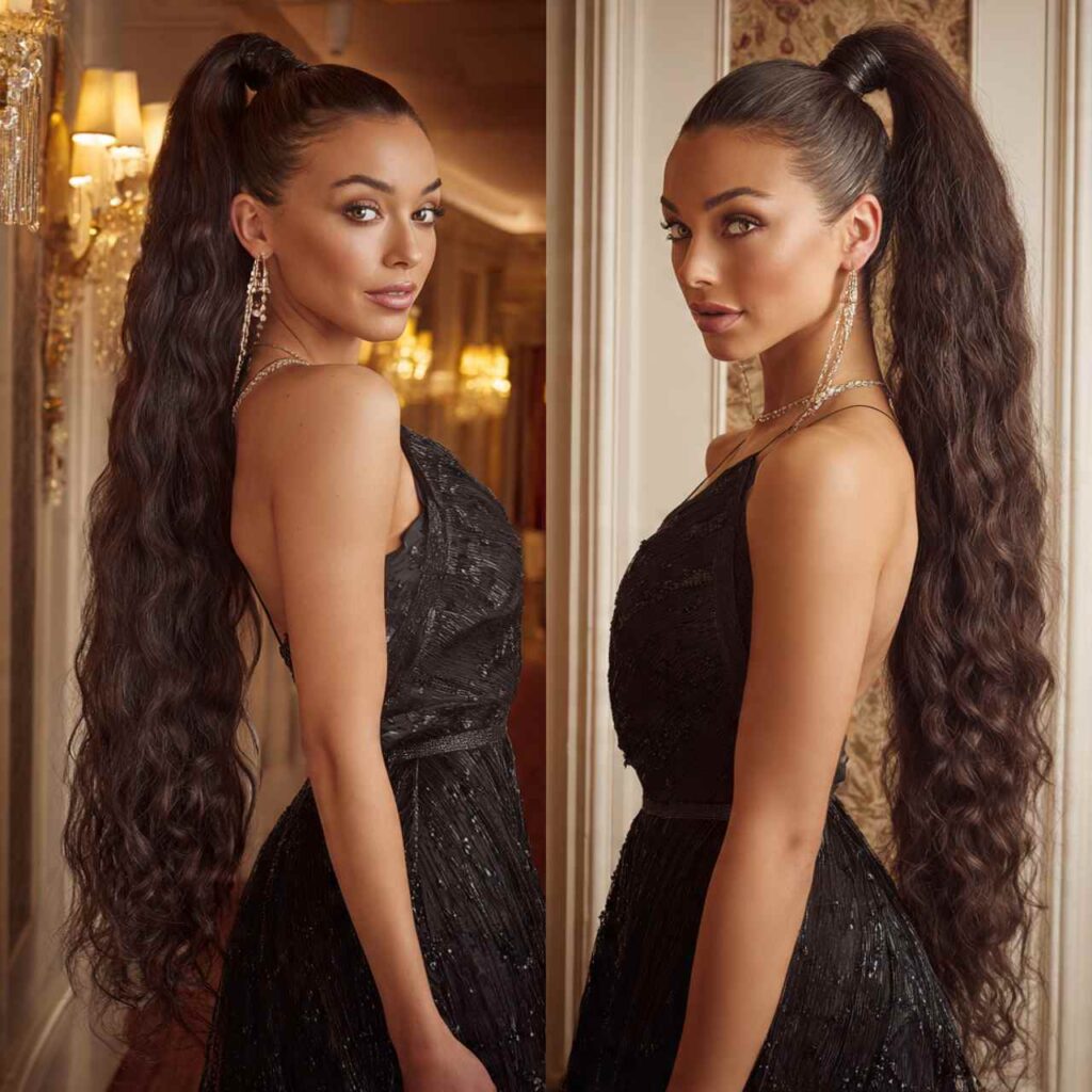 Secure your natural hair in a ponytail, then attach clip-in ponytail extensions that match your color and texture. Wrap a small section of extension hair around the base to blend. Style the extension to match your natural texture. This works for special events, photos, or anytime you want that long, full ponytail look. Modern extensions blend beautifully when properly matched.