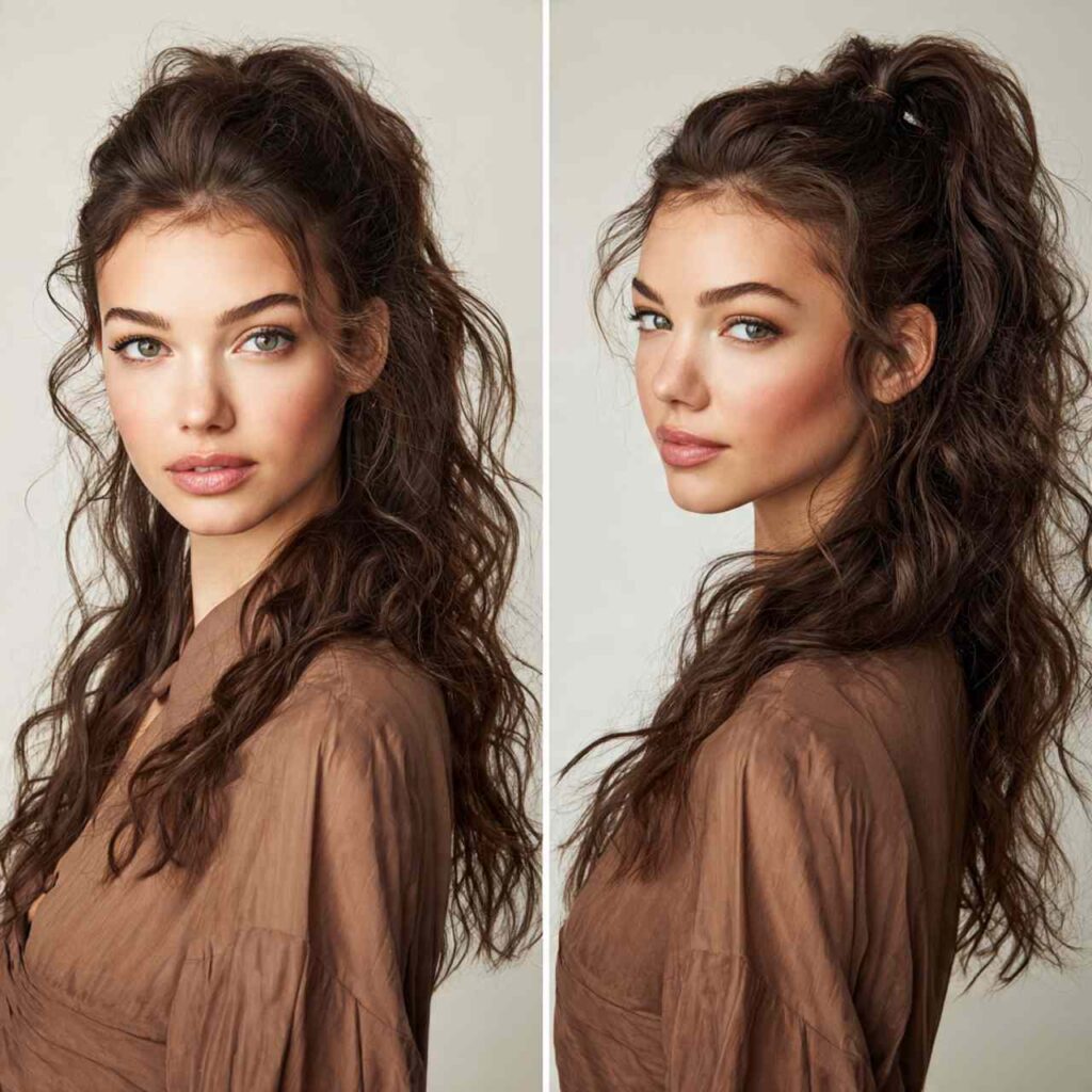 Create one ponytail at the crown, then create a second ponytail directly beneath it at the nape. The top ponytail drapes over the bottom one, creating the appearance of one extremely full, long ponytail. This technique adds serious drama and works for special occasions, photos, nights out, or anytime you want maximum impact. It’s surprisingly simple but delivers impressive results.