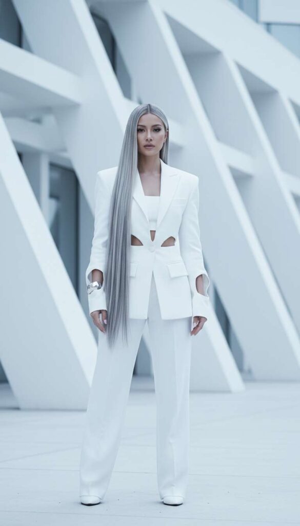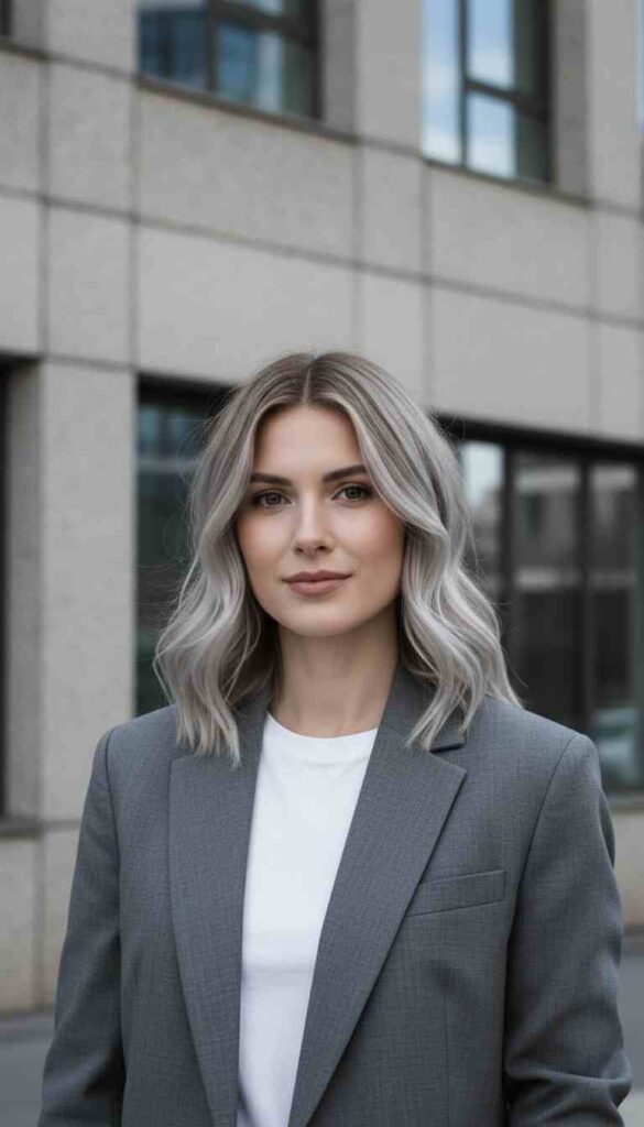 Cool silver blonde tones painted through light ash blonde hair creates icy sophistication. The balayage adds brightness while maintaining cool undertones throughout. This color is bold, modern, and requires commitment to toning.