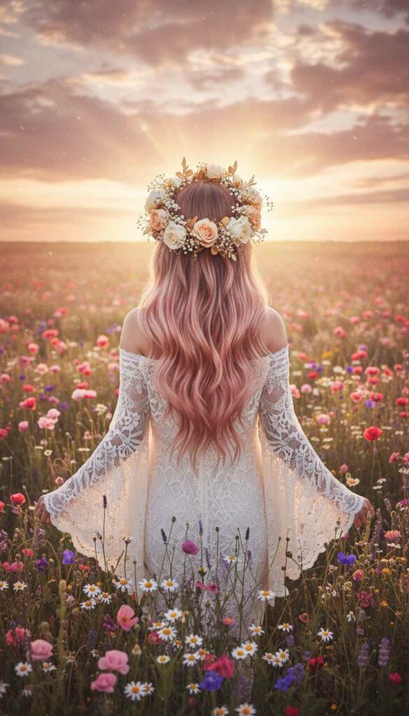 Rose gold and peachy copper tones swept through light brown hair create a romantic sunset effect. The warmer tones are concentrated toward the ends, creating a beautiful gradient. This color combination is feminine and on-trend for spring 2026.