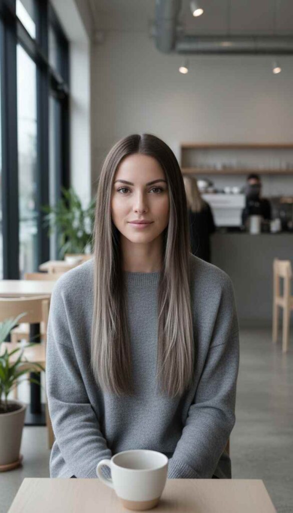 Cool icy blonde concentrated at the tips of ash brown hair creates modern edge. The balayage transitions from natural root to progressively lighter ash tones, ending in icy tips. This gradient approach is fashion-forward and striking.