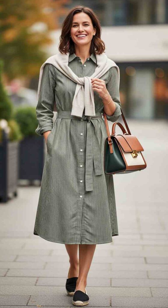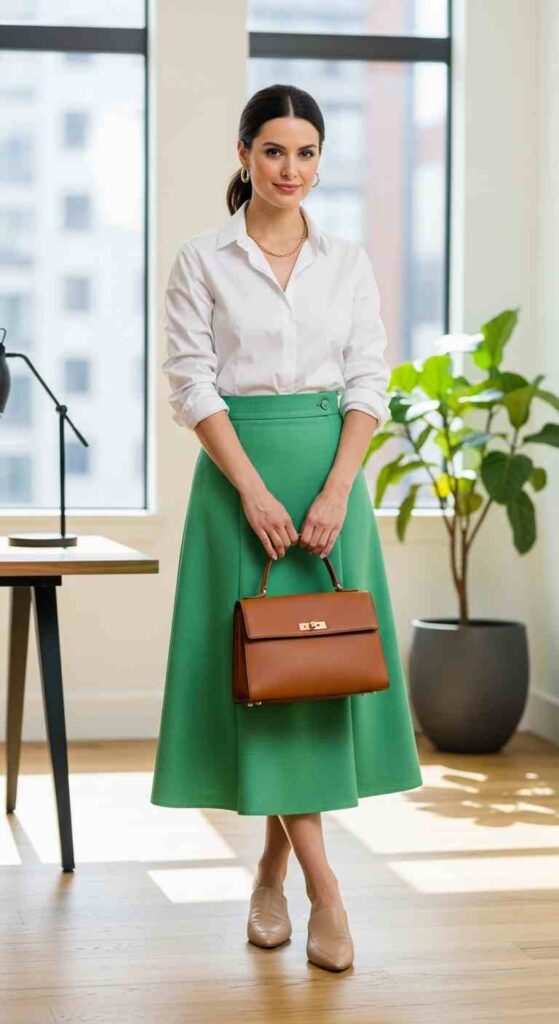 Classic shirt with midi skirt creates versatile transitional sophistication.