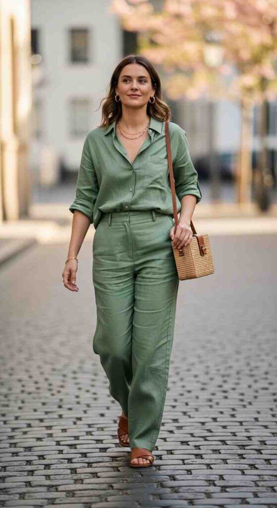 Coordinated linen top and pants creates breathable transitional ease.