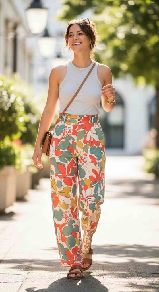 16. Printed Pants and Neutral Top