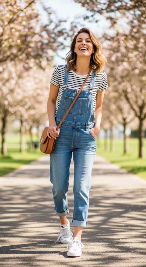 Casual denim or linen overalls with simple tee creates playful transition ease.