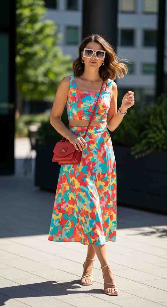 Matching crop and skirt or shorts creates modern transitional coordination.