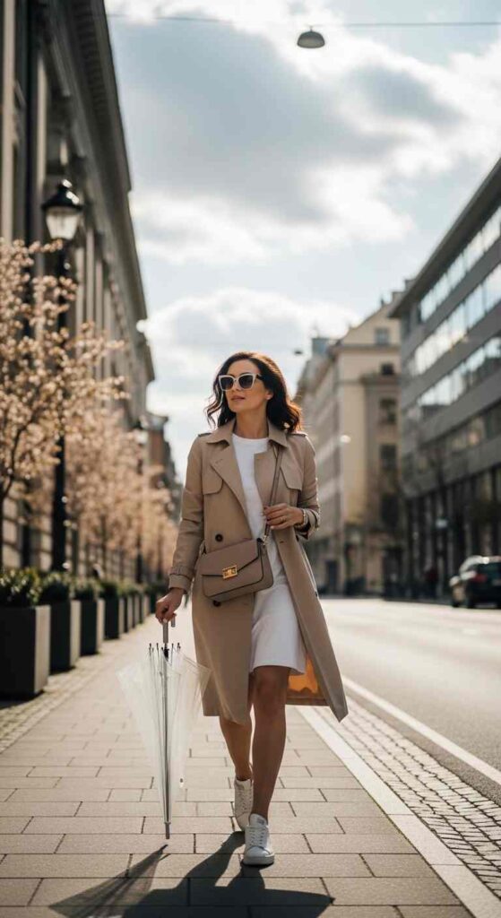 Classic trench over casual dress creates stylish transitional protection.