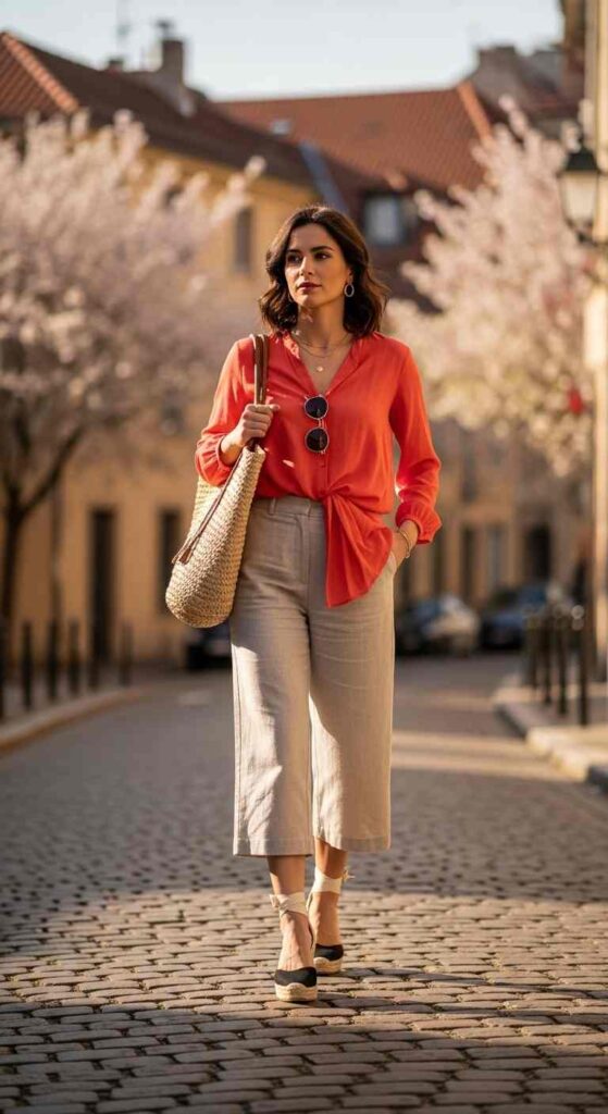 Linen emerges as transition star—the fabric breathes beautifully, looks appropriately casual yet chic, and actually improves with the slight wrinkling that active days create. Linen’s natural texture and breathability make it genuinely ideal for late spring through early summer.