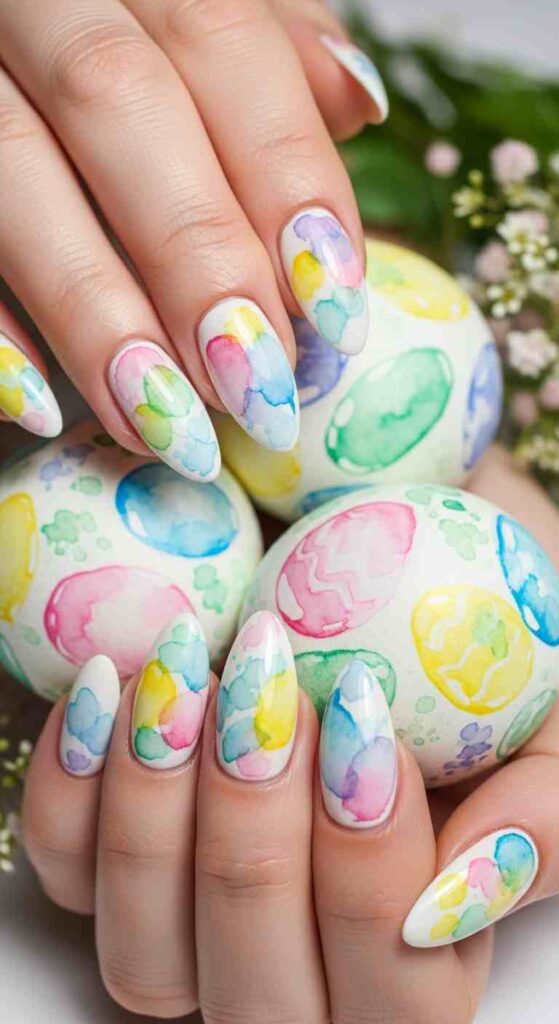 Soft watercolor technique creates artistic Easter egg beauty.