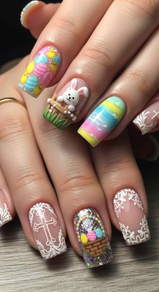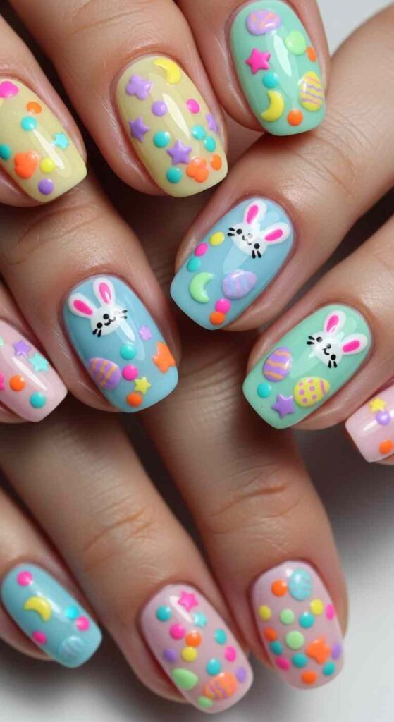 3D elements add dimensional interest—sculpted bunny ears, textured fuzzy accents, or raised egg designs all create tactile, dimensional beauty that flat painting cannot achieve. These techniques require acrylic or gel sculpting skills but create genuinely eye-catching results.