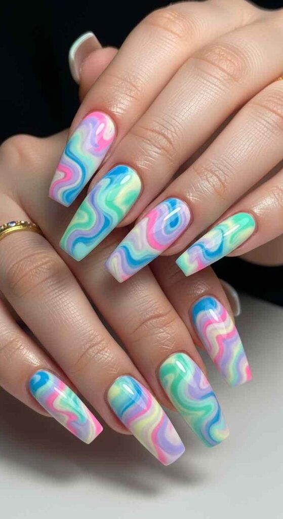 Marble technique in Easter colors creates elegant egg design.