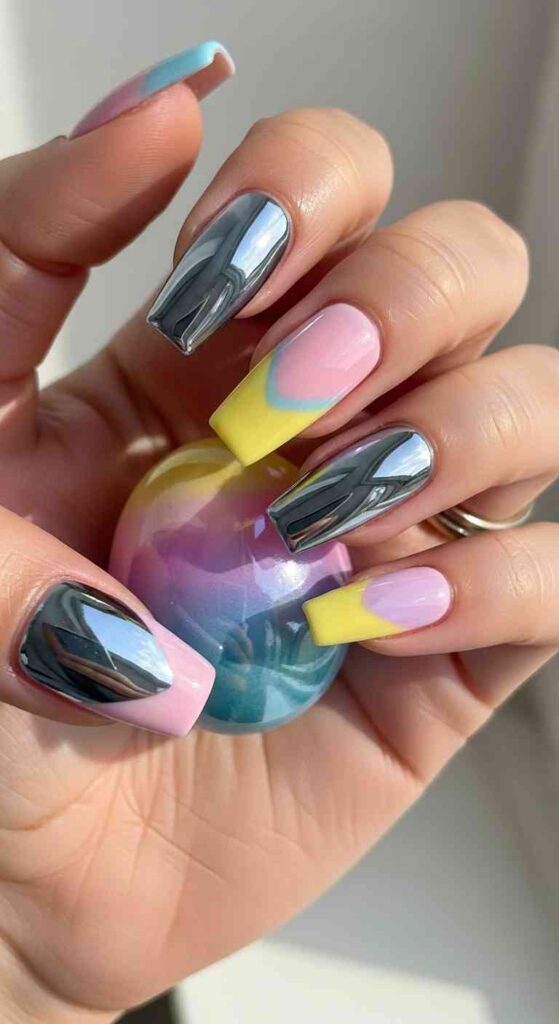 Pastel chrome sections creates modern Easter shimmer.