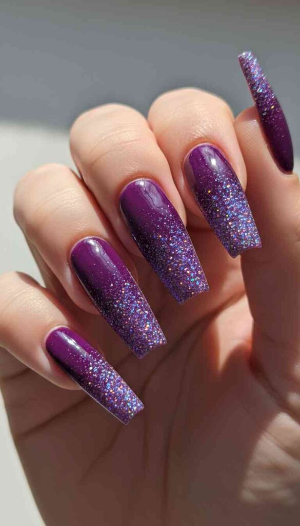 Saturated purple with glitter fade creates sparkly vibrant dimension.