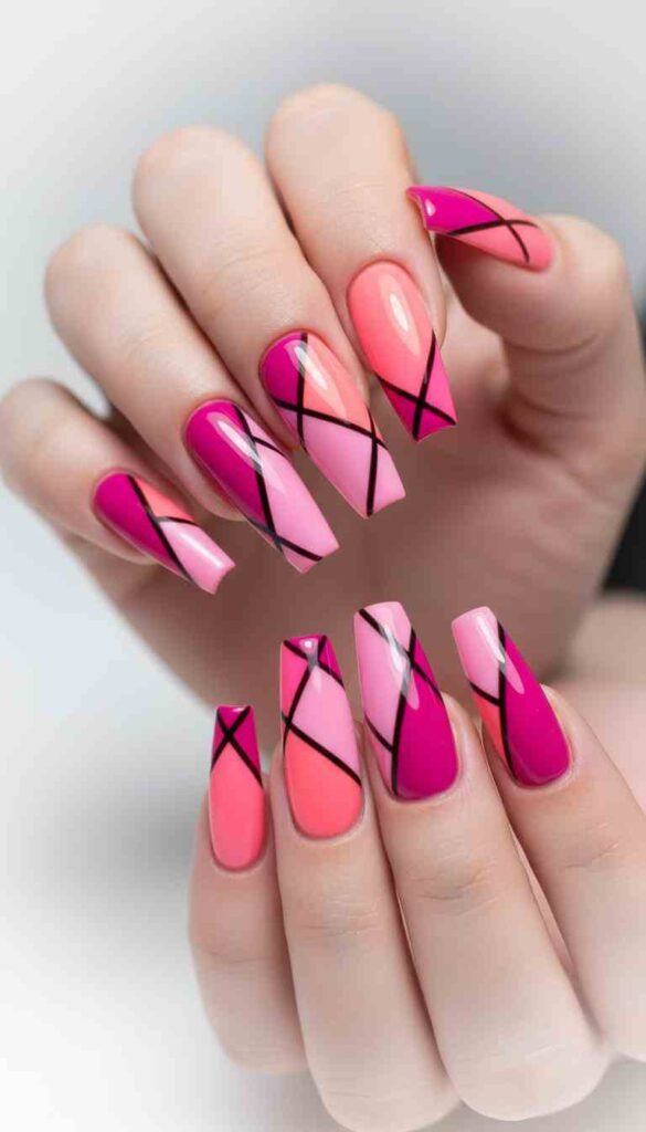 Geometric color blocks in multiple pinks creates graphic vibrant art.