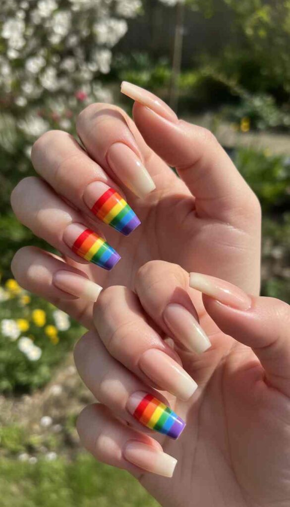 Nude base with rainbow striped accent nails creates vibrant pop.
