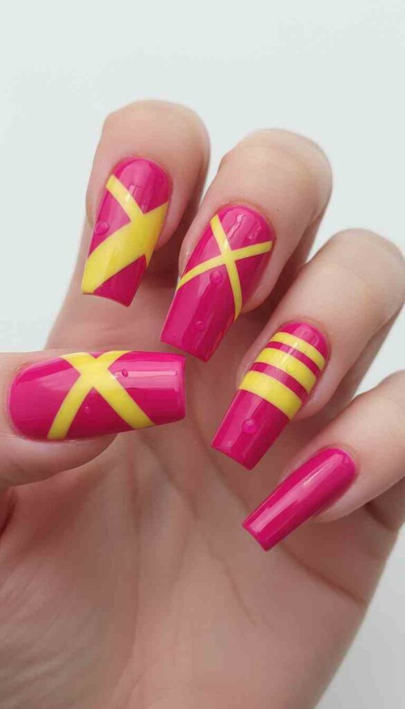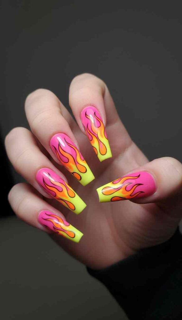 Hot pink base with neon yellow flame design creates graphic vibrant fire.