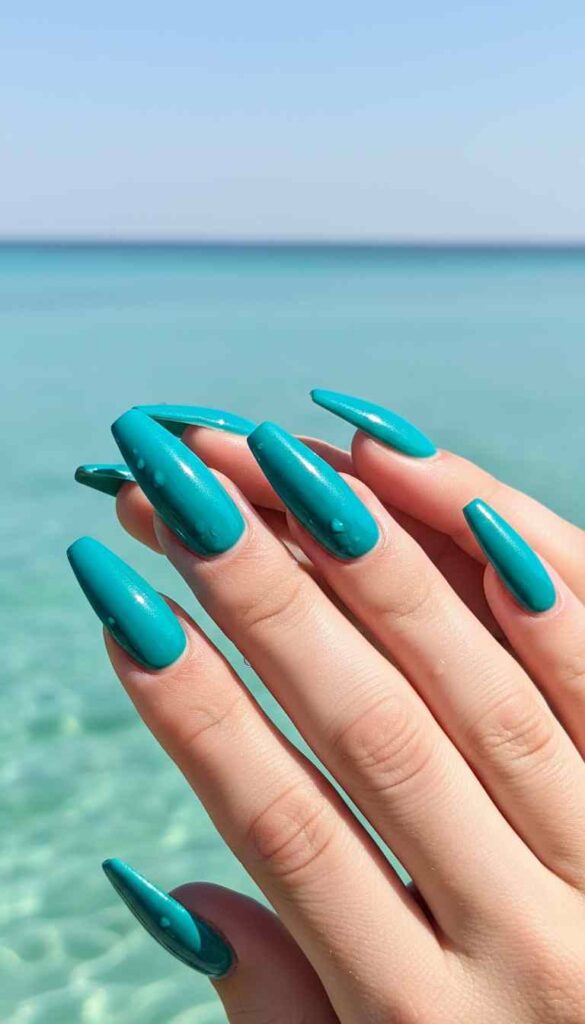 Solid vibrant colors look particularly striking on coffin nails because the dramatic length and taper create visual emphasis that shorter shapes cannot match. A neon coral that might appear simply bright on short square nails becomes genuinely bold on long coffins where the color dominates your hand’s visual landscape. The shape itself amplifies color impact.