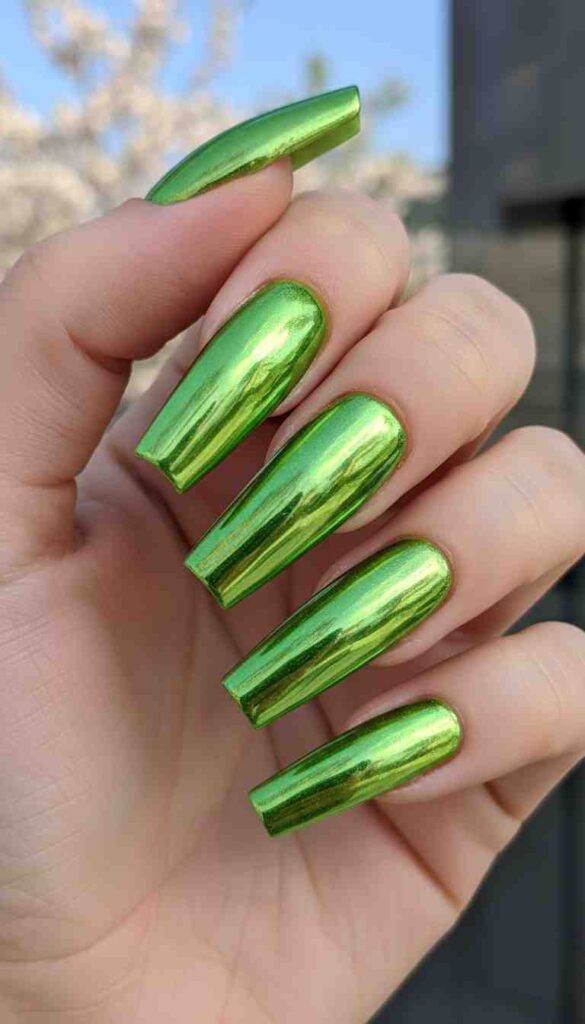 Metallic lime chrome creates futuristic vibrant spring drama.