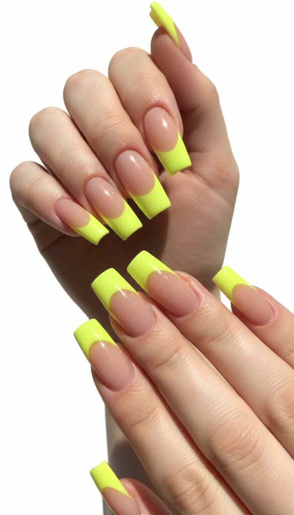 Electric yellow French tips on nude creates bold modern vibrant contrast.