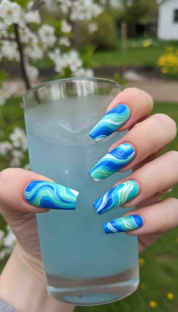 Vibrant blue marble with white creates dimensional oceanic vibrance.