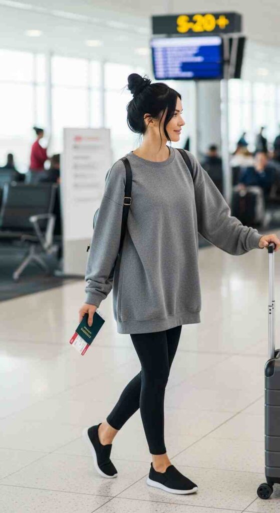 Leggings and oversized sweatshirt creates comfortable flight outfit.