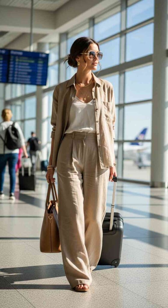 Matching linen pants and top creates wrinkle-embracing travel elegance.