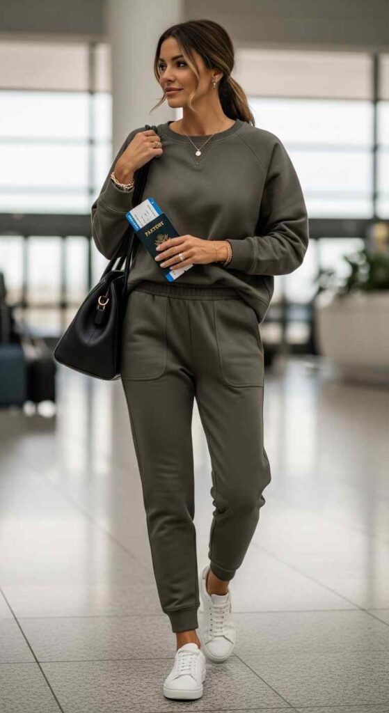 Elevated matching sweat set creates comfortable flight-to-destination outfit.