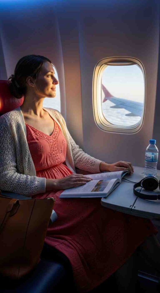 Compression and circulation—avoiding very tight clothes aids circulation during long flights while layers accommodate varying airplane temperatures.