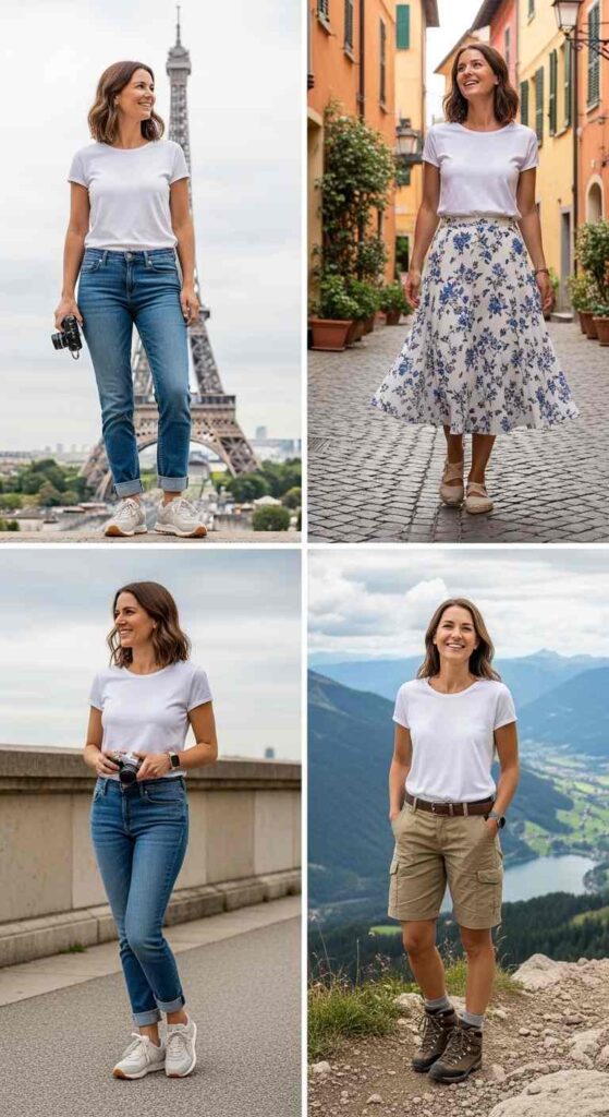Simple white tee with multiple bottoms creates capsule travel foundation.