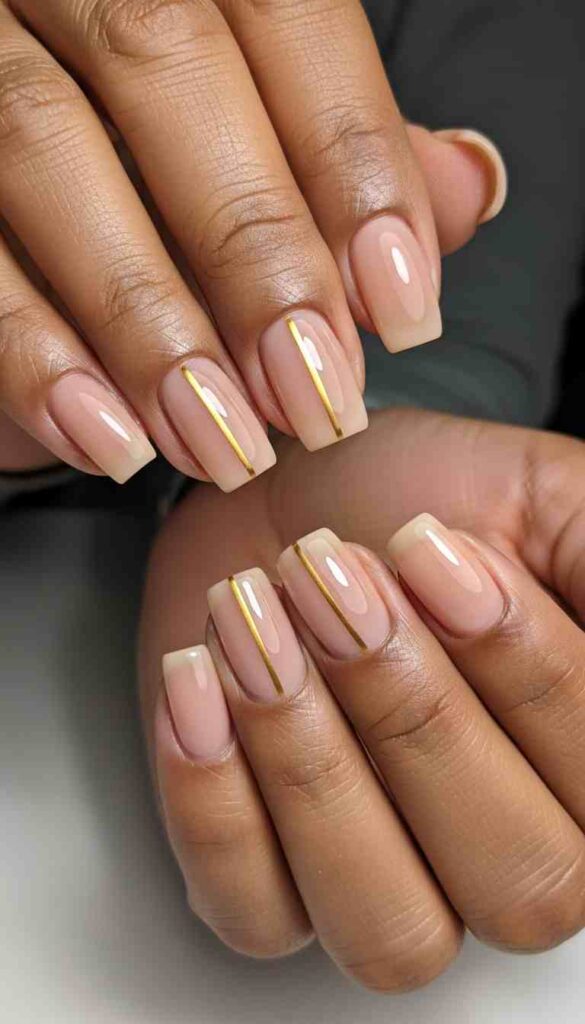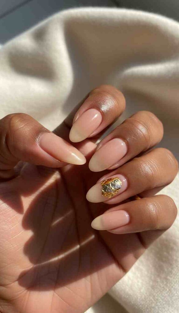 Nude base with gold foil accent creates luxe minimal elegance.