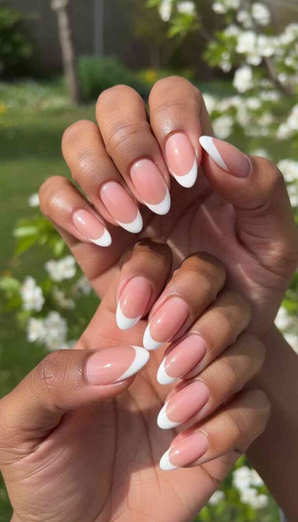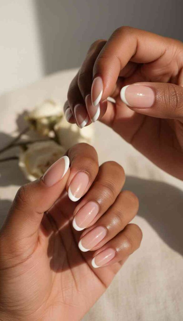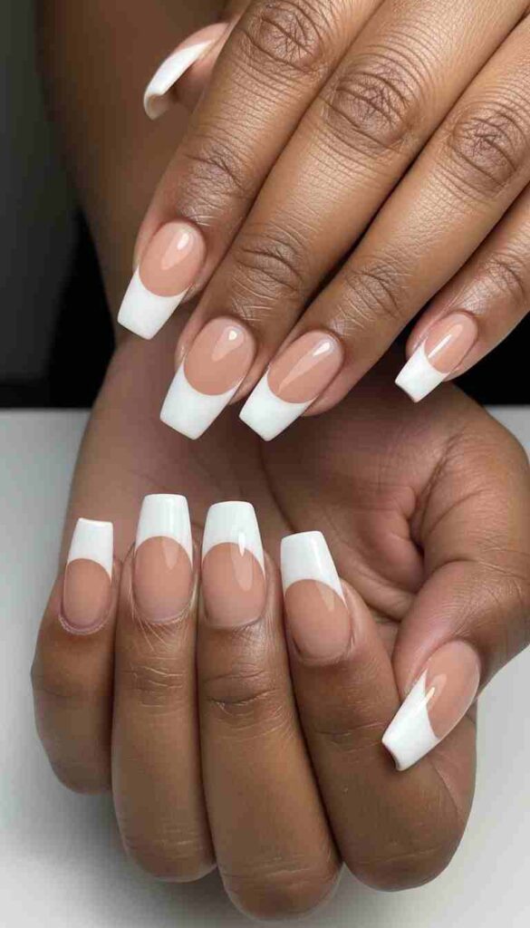 Crisp white French tips on natural base creates high-contrast minimal elegance.