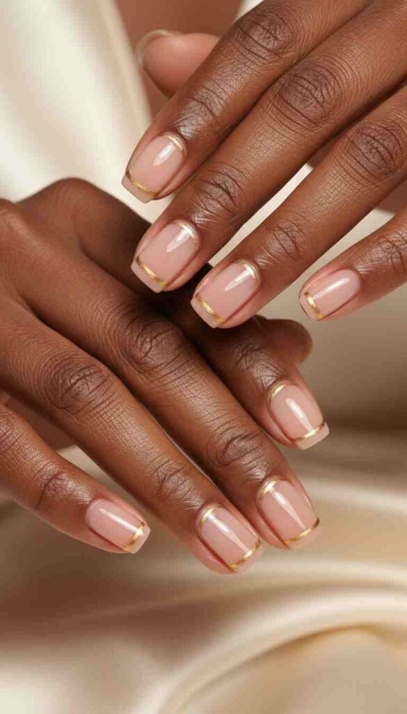 Delicate gold outlining nail edge creates luxe minimal frame.