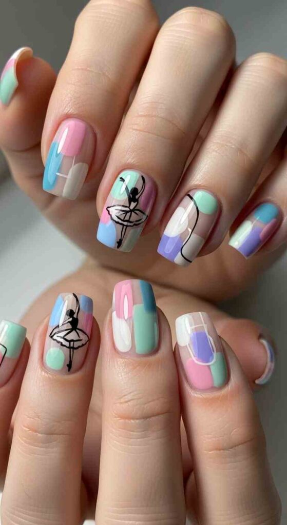 Strategic bare nail with spring colors creates contemporary ballerina art.