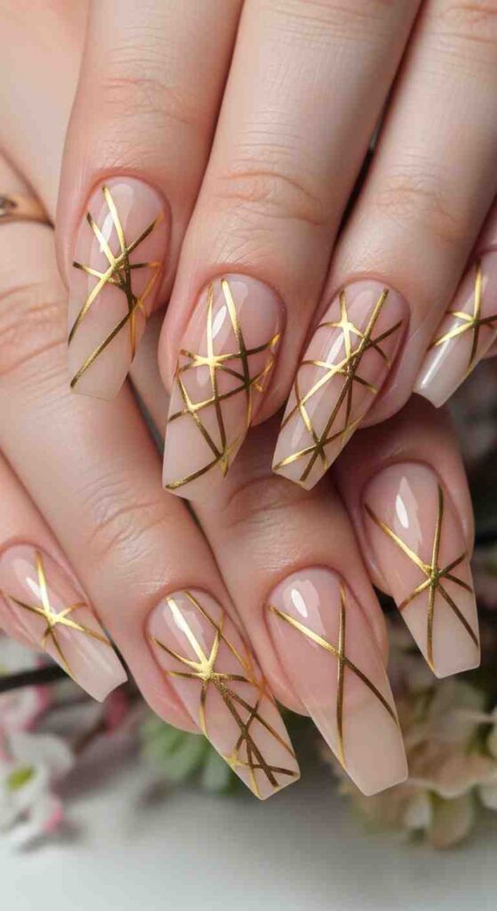 Precise geometric patterns in gold creates modern ballerina spring luxury.