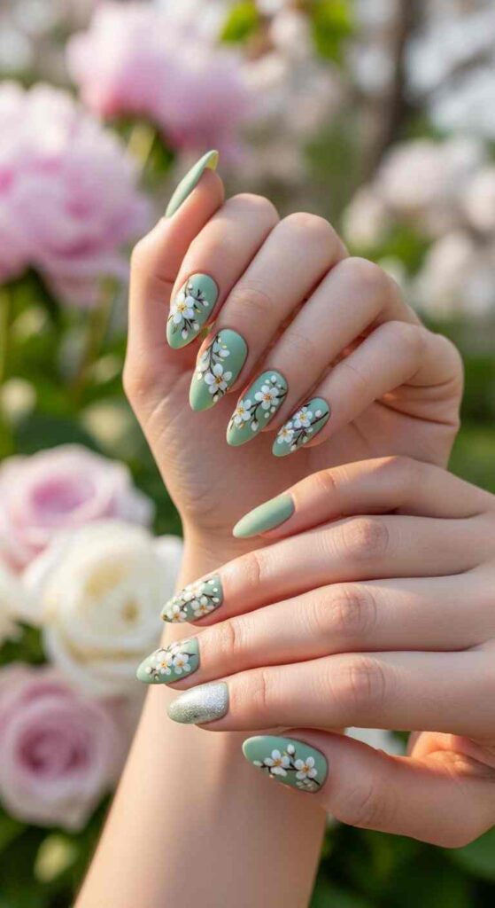 Muted sage green creates botanical ballerina spring sophistication.