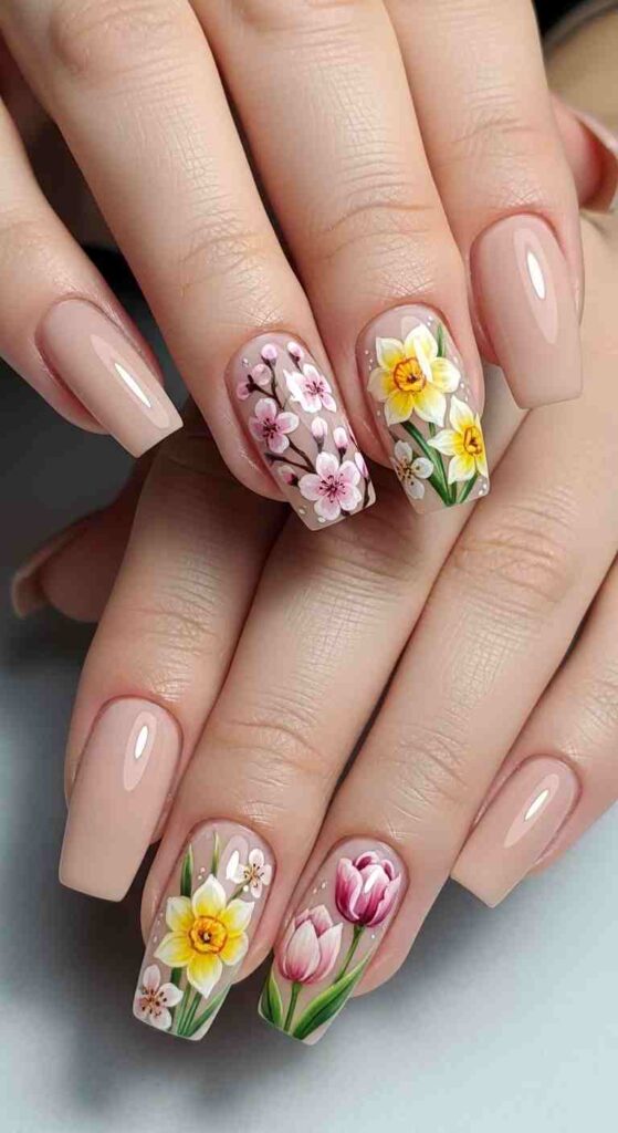 Hand-painted spring flowers on ballerina nails creates botanical glamour.