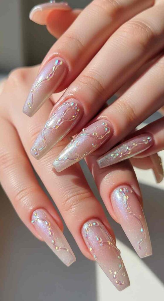 Color restraint—glamorous ballerina nails often favor refined color palettes (nudes, soft pastels, classic reds, metallics) over juvenile brights or overly playful patterns.