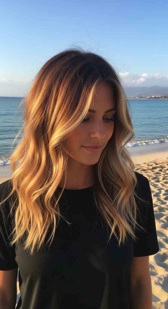 Beach-ready styling—summer balayage looks particularly stunning styled in beachy waves that showcase the dimensional color.