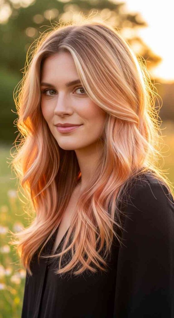 Blonde balayage with peachy tones creates unique summer warmth.