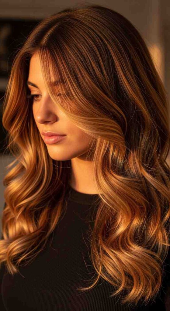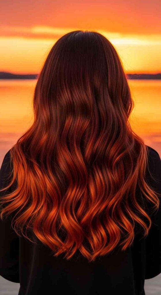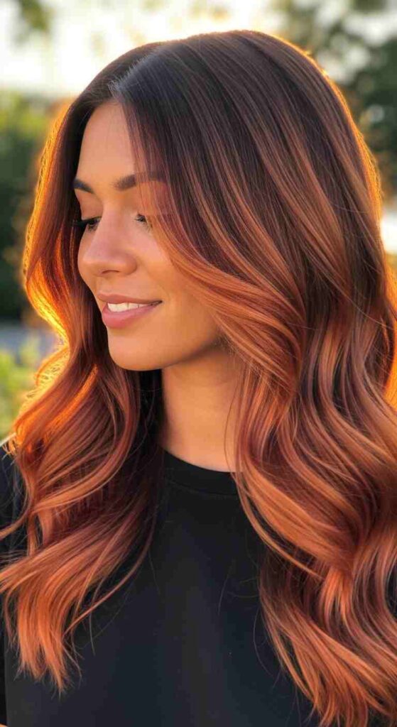 Auburn base with bright copper balayage creates fiery summer warmth.