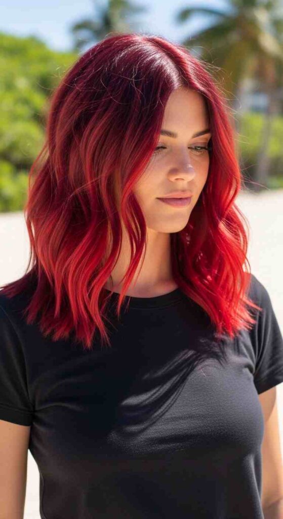 Auburn base with brighter red balayage creates dimensional summer fire.