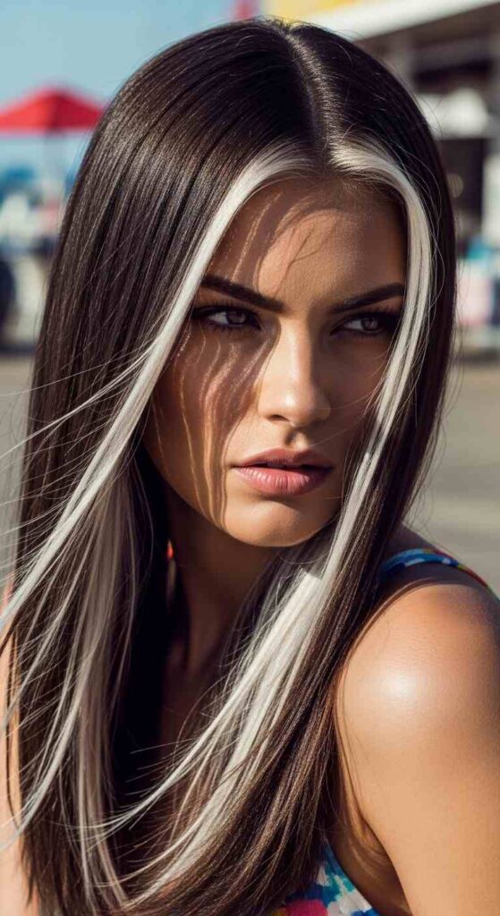 Dark hair with platinum balayage only around face creates bold summer contrast.