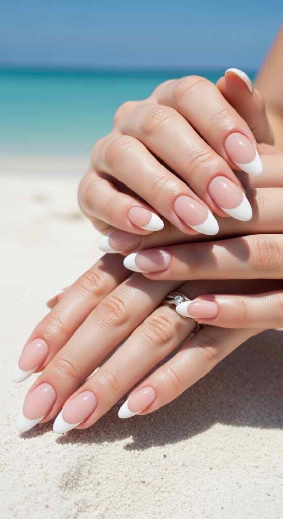 Traditional white French tips creates timeless summer elegance.