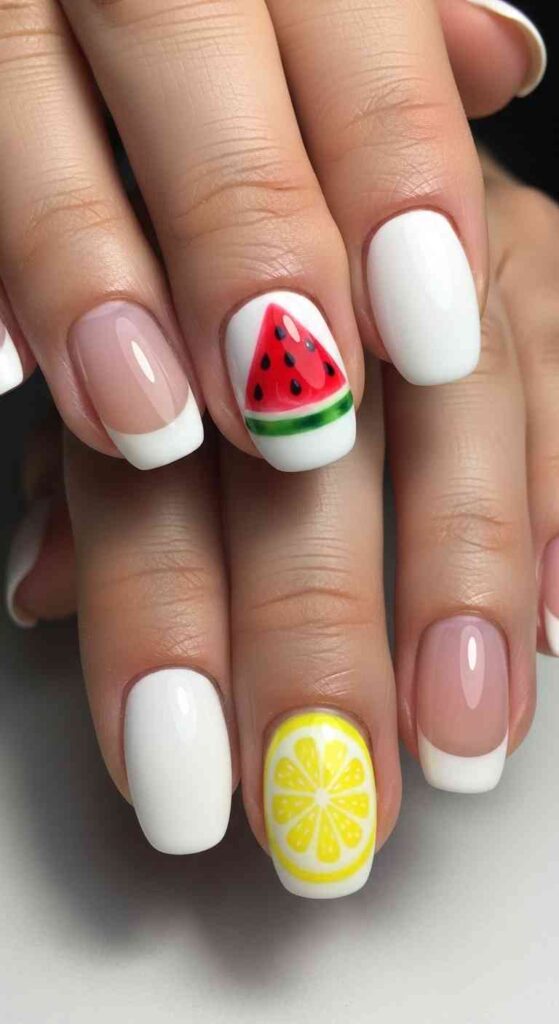 White French with tiny fruit slice on accent nail creates summer whimsy.