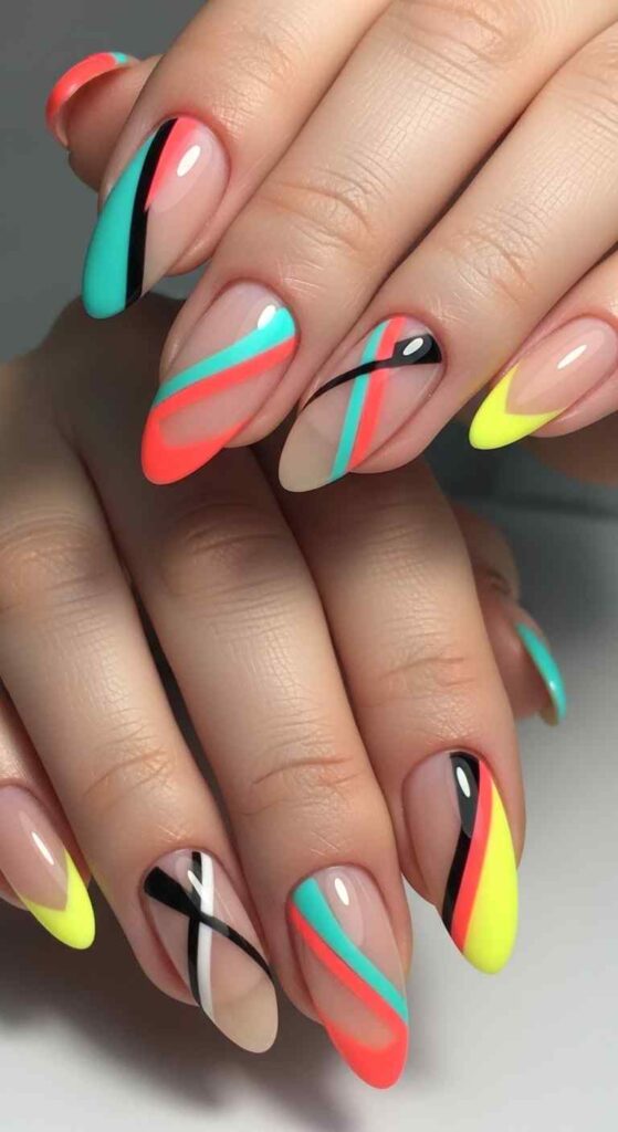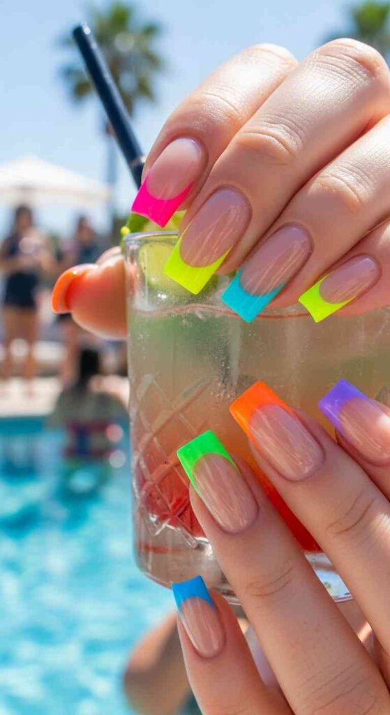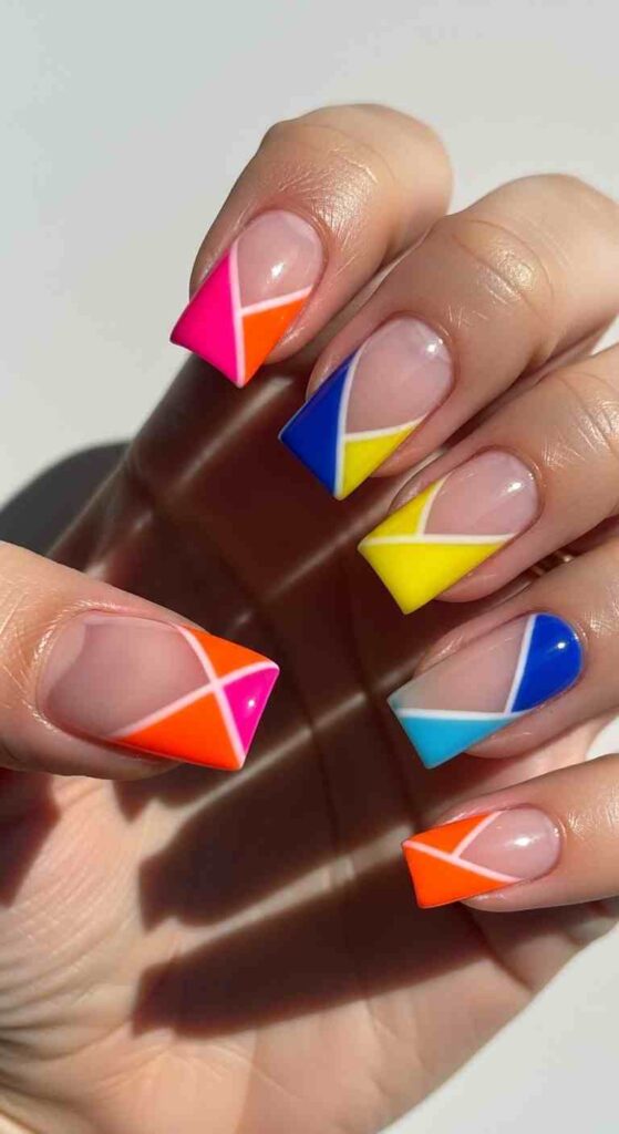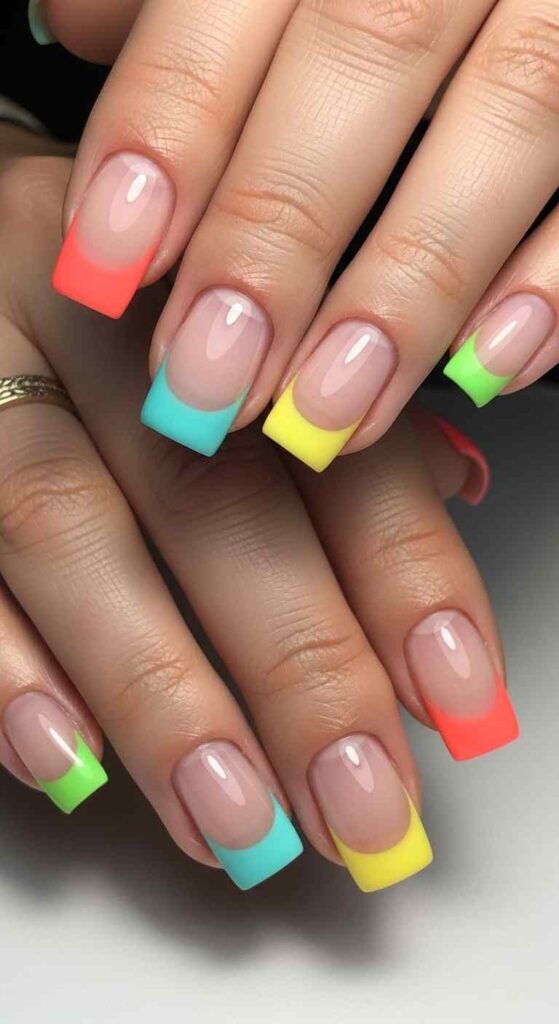 Each nail different neon tip creates vibrant summer rainbow.