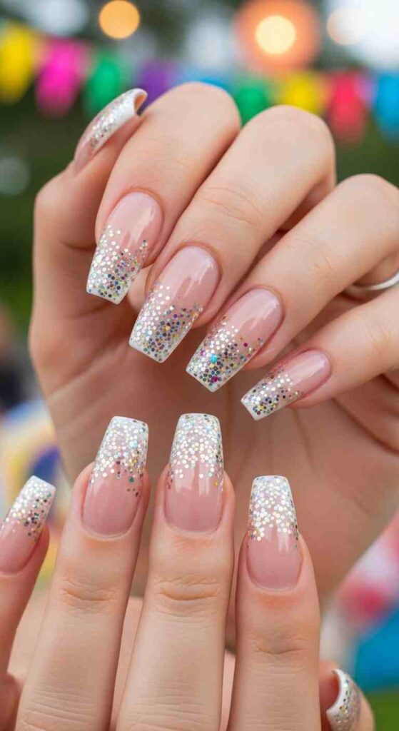 Tips fading into glitter creates sparkly summer celebration.