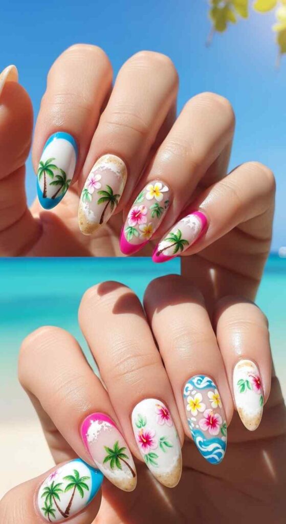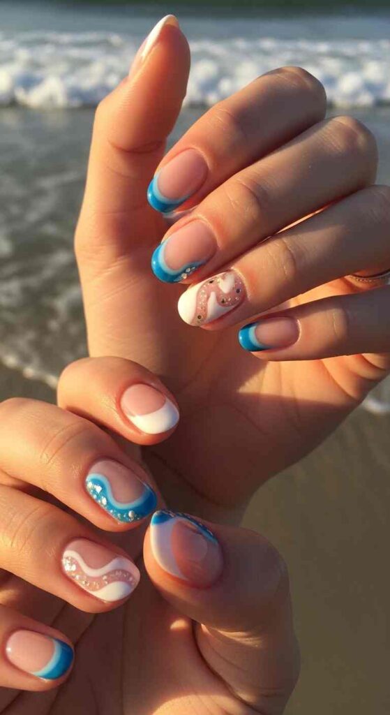 Beach elements—wave patterns, ocean colors, or sandy neutrals with bright tips all evoke summer beach aesthetics.